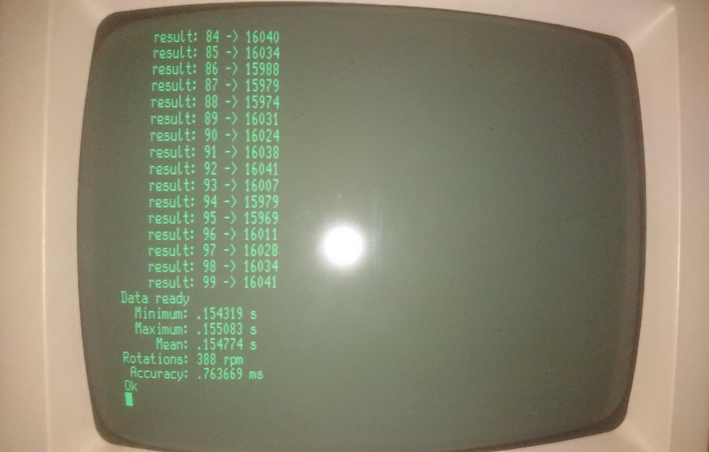 That should give us the counter of exactly one disk rotation - that is LOOP2. We need 5 (INX) + 10 (IN) + 4 (ANA) + 10 (JZ) = 29 CPU cycles. We have a 16 bit counter in register D. Will it overflow? Let’s assume the rotation speed is at the standard 300 rpm, that means one rotation takes 0.2 seconds. At 3 MHz, these are 600,000 CPU cycles. Divided by 29 we get 20,690 which is smaller than 64k - good. No problem here.