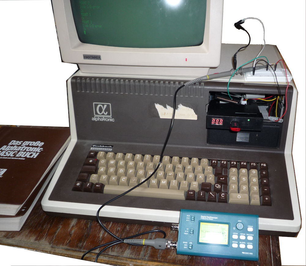 I measured the 2nd drive, directly via the floppy connector cable. I used the 5V and GND from the power connector. I also used a pull-up resistor (1kOhm). The green cable is the index signal (pin 8 on the floppy connector). I had this easy access to the connections and was able to measure the floppy drive while it is running in the Alphatronic because shortly before that, I managed to get the GoTek Floppy Emulator running as the first drive. Here’s how it looks: