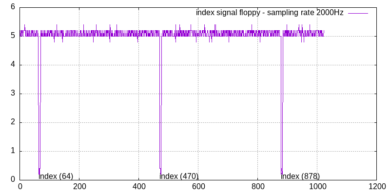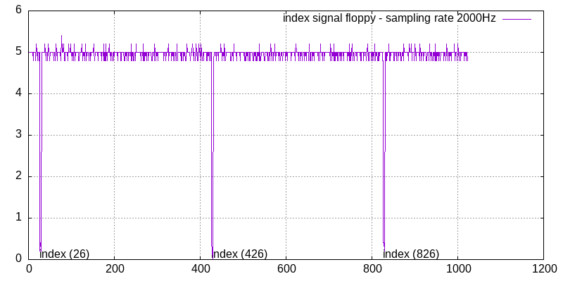 Each line after the header corresponds to one sample. As the sample rate is 2000 Hz, each sample represents 0.5ms. If we count the lines between two falling edges, we get the time it took and can calculate the length of one index signal from the floppy drive. In this example, the first falling edge is at line 30, the next is at line 426. This gives us 426 - 30 = 396 samples or 198ms. Which is pretty close to the expected 200ms. So, this gives us already a hint, that the floppy drive is not too much off, because 198ms are 5.05Hz or 303 rpm… and not 388 rpm…