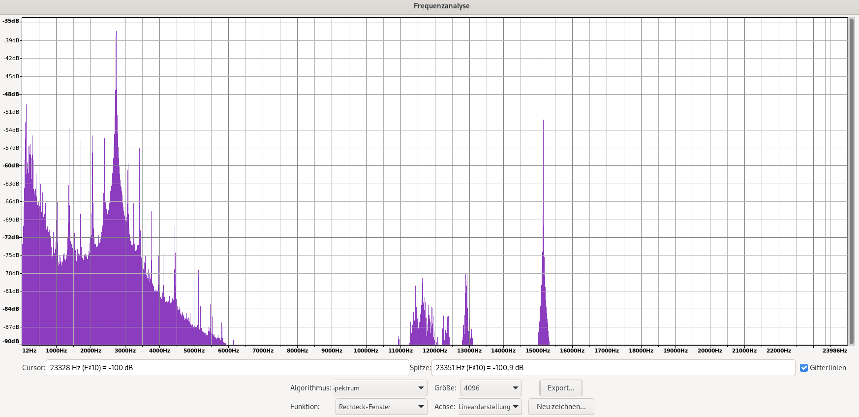 The other peak you can see in the spectrum is at 15150Hz. This is maybe the line frequency of the monitor that is running at the same time. For PAL the line frequency is 15625Hz. Which is not exactly what I expected… but still within the specification of the monitor (+/- 500Hz).
