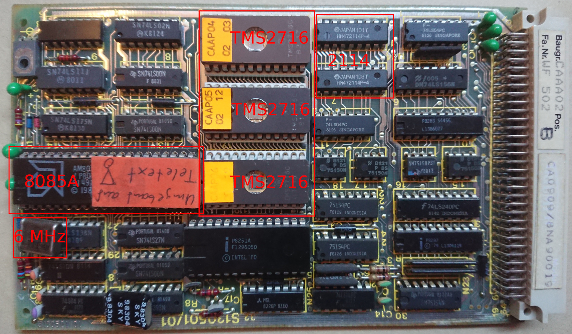 The ICs that are used for provided the ROM are 2716 (Texas Instruments), which is a “2048 x 8 erasable ROM”. We got 3 of these on the CPU PCB, which gives room for a 6kB firmware. This is probably the MOS (Mikrocomputer-Operating-System) which is mapped from 0x0000 to 0x2FFF. Not everything is usable in this area, since 1k of RAM is mapped from 0x1800 to 0x1BFF (and 0x1C00 to 0x1FFF is unusable).