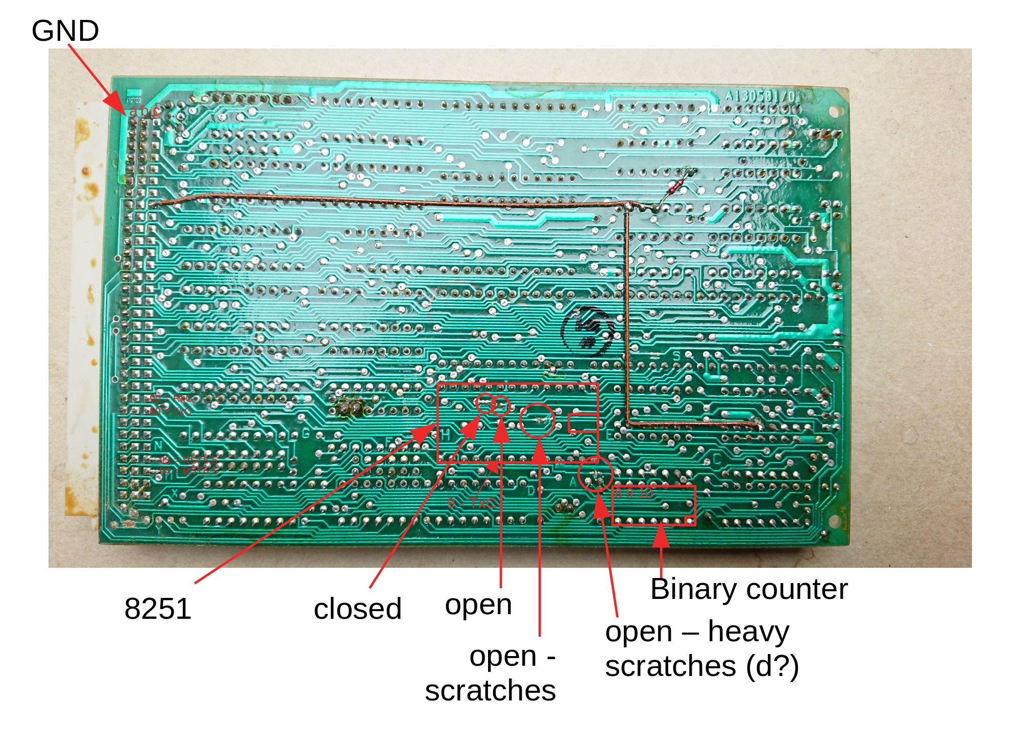 Especially scary is the open jumper with the heavy scratches. It seems to disconnect the TxC signal line (pin 9) of the 8251 from the binary counter output. This might be jumper “d”. That would mean, that there is no clock connected… and hence the 8251 can’t transmit any data.