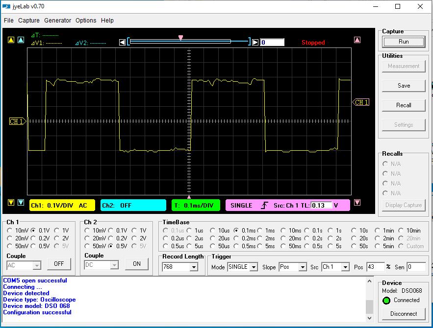 There is also jyeLab, a PC oscilloscope program. It supports “Realtime waveform display/capture”. However, this is a Windows-only program. The latest version 0.70 is from 2014, but it still runs on Windows 10. My virtual machine setup seems to be too slow to have a continuous data stream, but single shot mode works:
