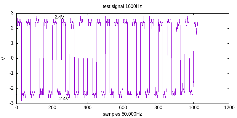 After a couple of empty lines and a separator line, the actual data begins at line 17. Each line represents one sample. I’ve only kept in the sample above some values, e.g. in starts with “117”. This is using the reference of 129: 117-129=-12. -12 * 0.2V = -2.4V. A couple of samples later the value is at 141: 141-129=12. 12*0.2V=+2.4V. In total, we span roughly 4.8V, almost 5V, which is the test signal.