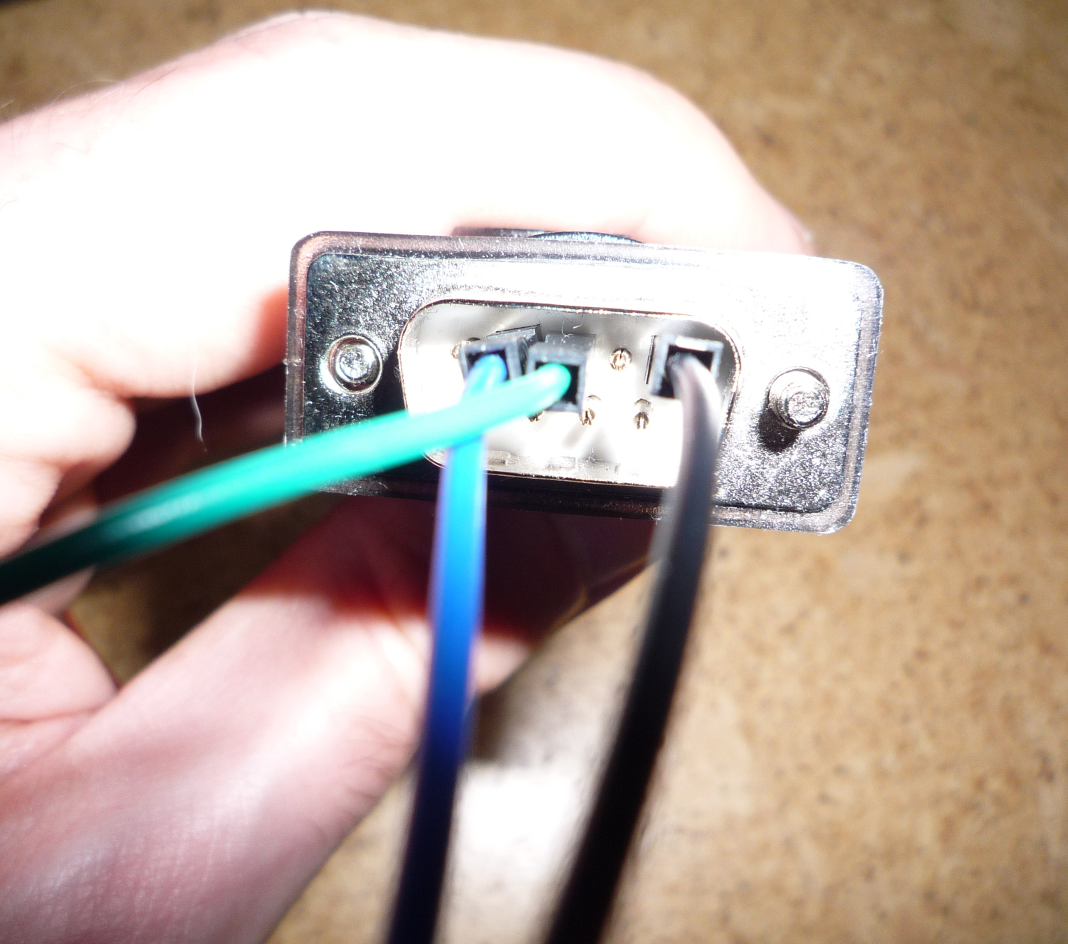 As you can see, I connected pin 5 (GND, black wire) and pin 2/3 (TxD/RxD, green and blue wire). The green and blue wires are connected to each other via a red wire. The black ground wire has been extended by a pink wire.