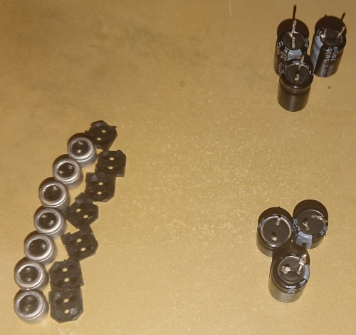 These were 7 SMD caps I removed. Since the legs are broken, it was a fiddle to measure them and the connection was probably not so good, which might add some resistance. But here are the measurements for them: