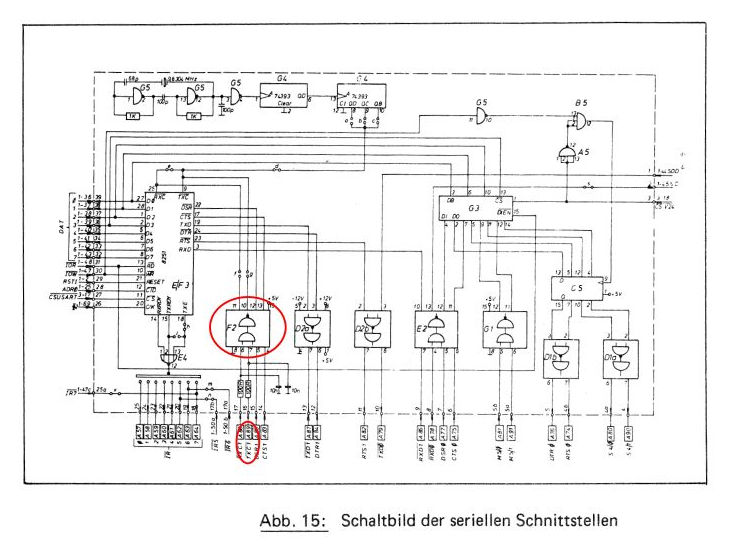 You can see, that the external TxC line at the bottom is connected to a chip numbered “F2”. This is actually a 75154 Quad Differential Line Receiver. Input is +/-25V max and output is TTL. The output is connected to the 8251.
