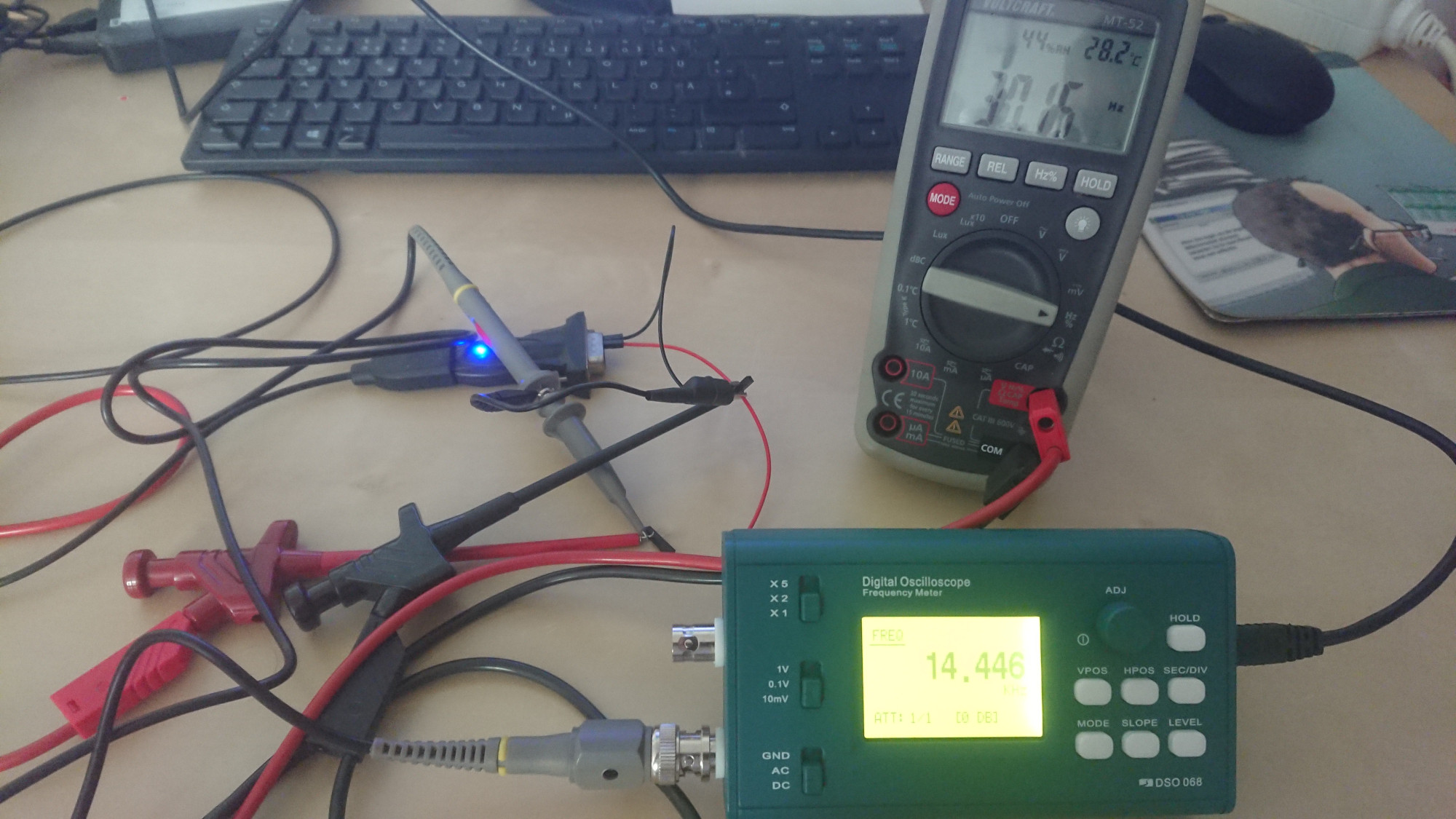 Ok, the first try is not so promising. There is some toggling, but the frequency meter jumps largely, e.g. between 5kHz and maybe 60kHz? Not very stable, that clock is probably not a very good quality.