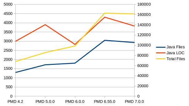 You can see a couple of big changes: between 2012 and 2016. I think, that is caused by the switch from SVN to Git - when many things were moved out of the monorepo. The next is probably PMD 6 release, which happened end of 2017. And the last big change is probably PMD 7.