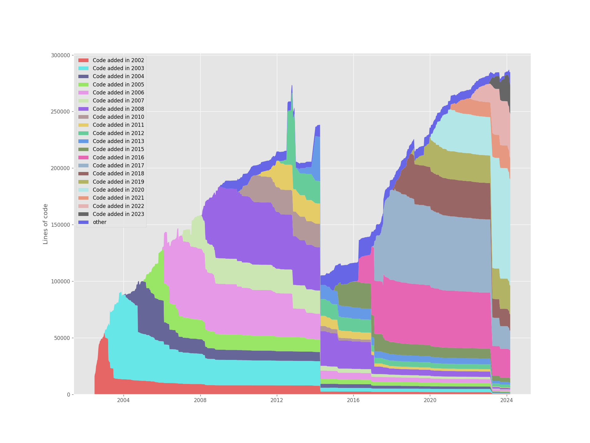 The program Git of Theseus can generate interesting graphs that show how the code added in different years changed: